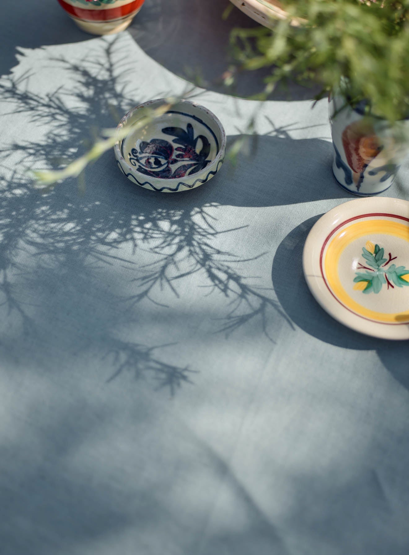 - A beautifully textured linen tablecloth in a soft, calming blue